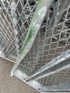 現場から戻ってきた足場材には、コンクリートや塗料が付着することがあります。これらが残ったままだと、クサビが入りにくかったり、滑りやすくなったりと、作業効率と安全性が低下します。もちろん汚い資材になってしまいますので見た目の綺麗さも担保できません。